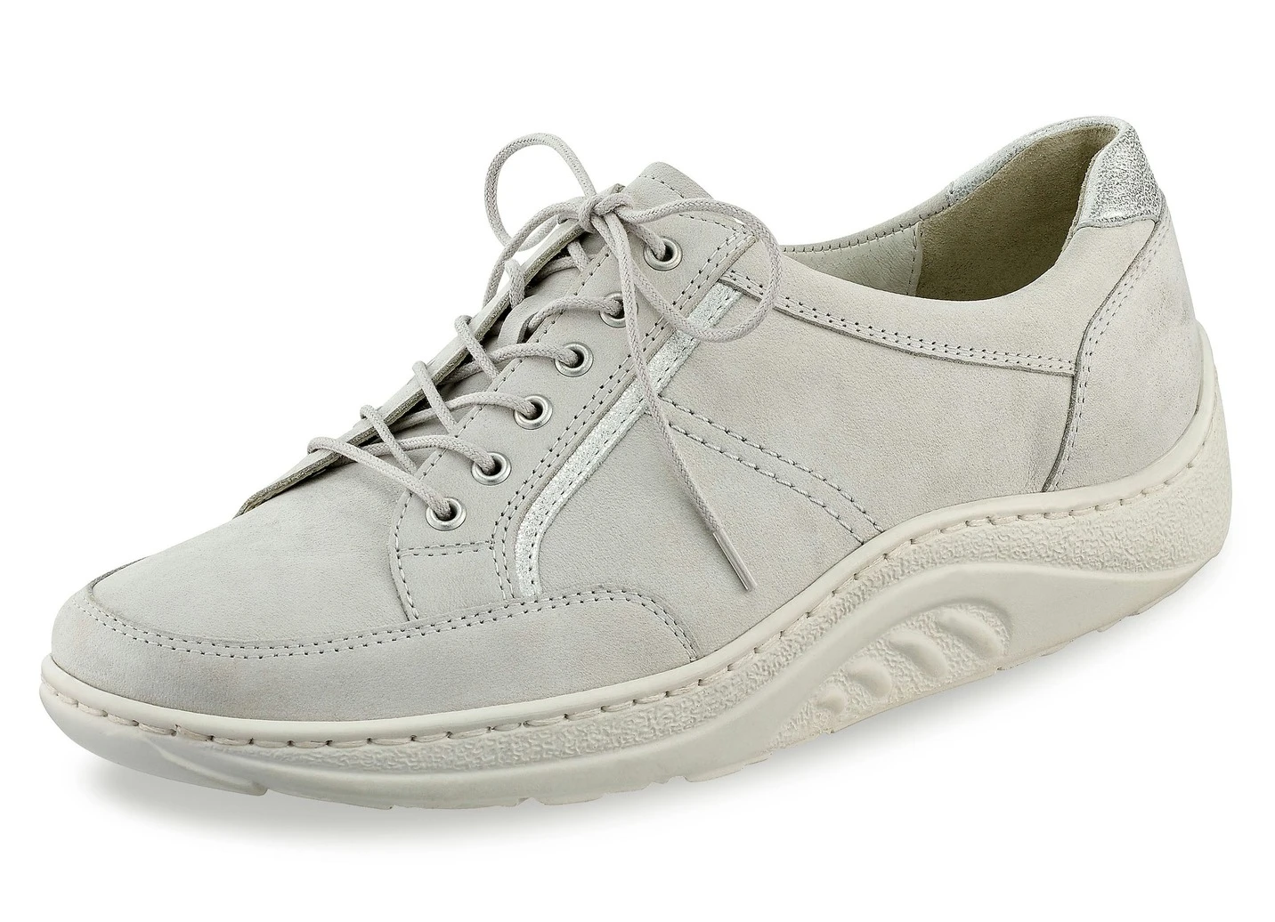 Schnürschuh aus Rind-Nubukleder, mit edlen Metallicleder-Einsätzen: Weite H, ledergefüttertes Quartier, herausnehmbares Lederfußbett, leichte handgenähte PU-Luftpolster-Profilsohle mit Fersendämpfung, bester Abrollfunktion und breiter Auftrittsfläche, daher Gelenk unterstützend sowie 30 mm Keilabsatz