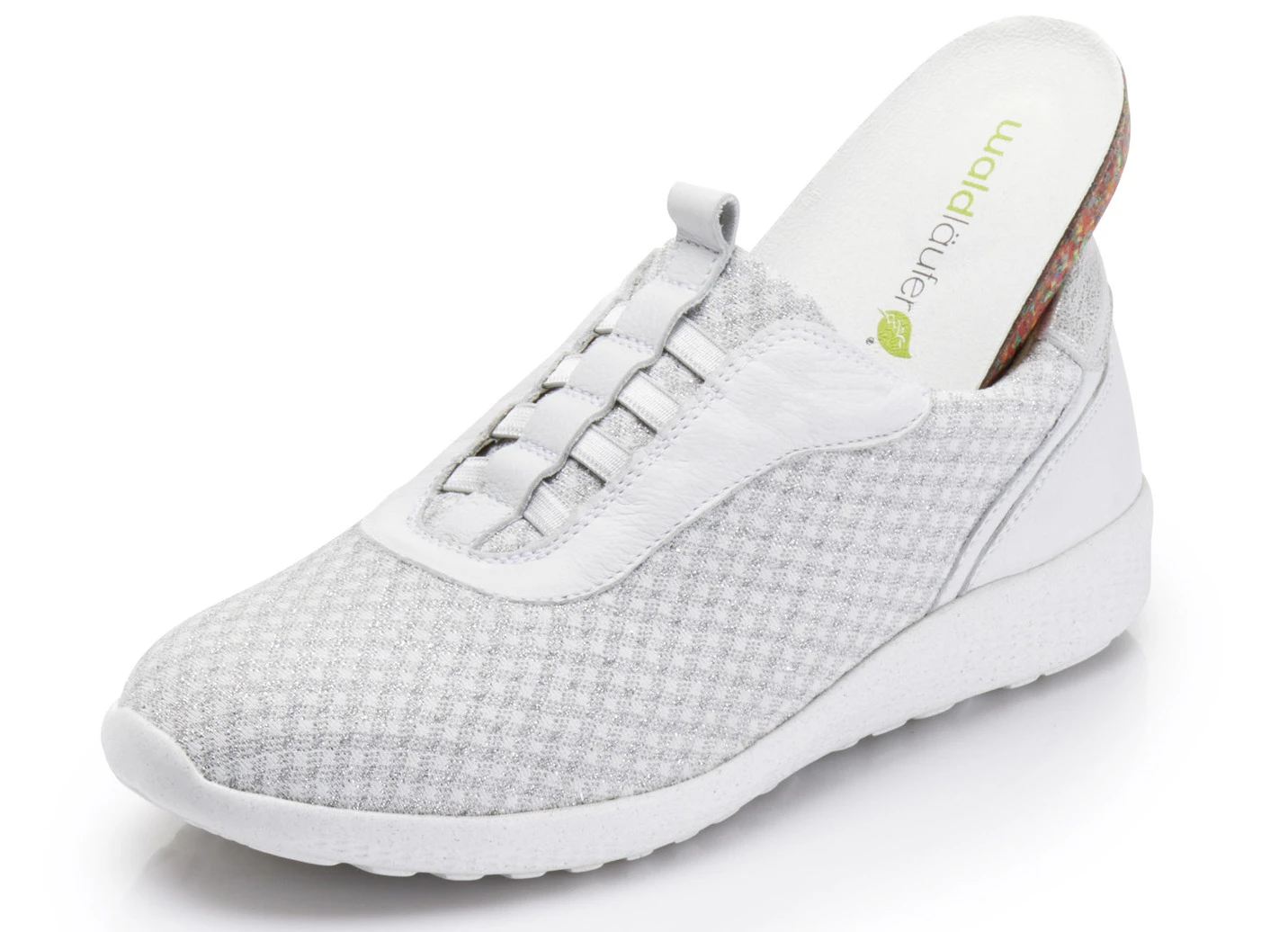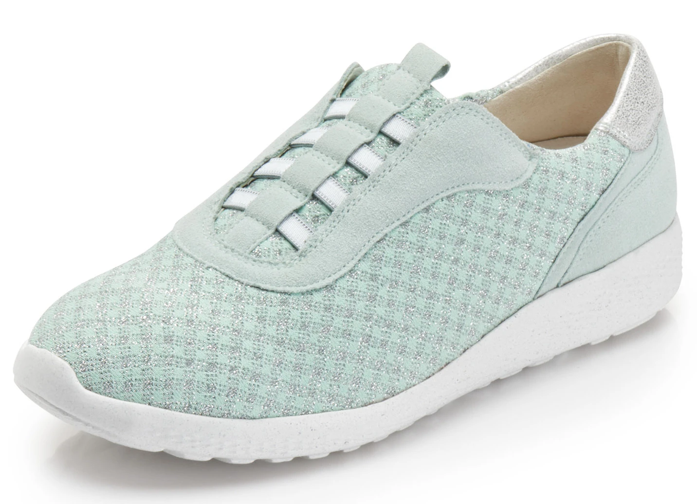 Slipper aus edel glitzerndem Textilmaterial mit hochwertigen Leder-Besätzen: in Weite K, dekorativ eingesetzte Gummizüge sowie ledergefüttertes Quartier. Herausnehmbares Lederfußbett und superleichte EVA-Luftpolstersohle aus recycletem Material. 15 mm Keilabsatz