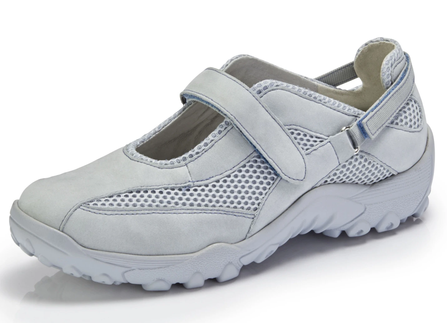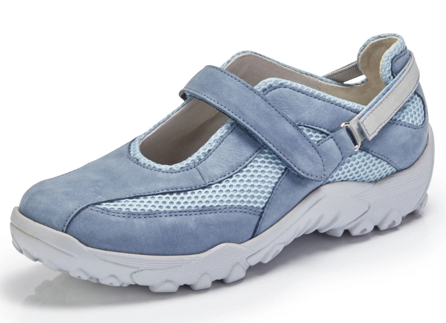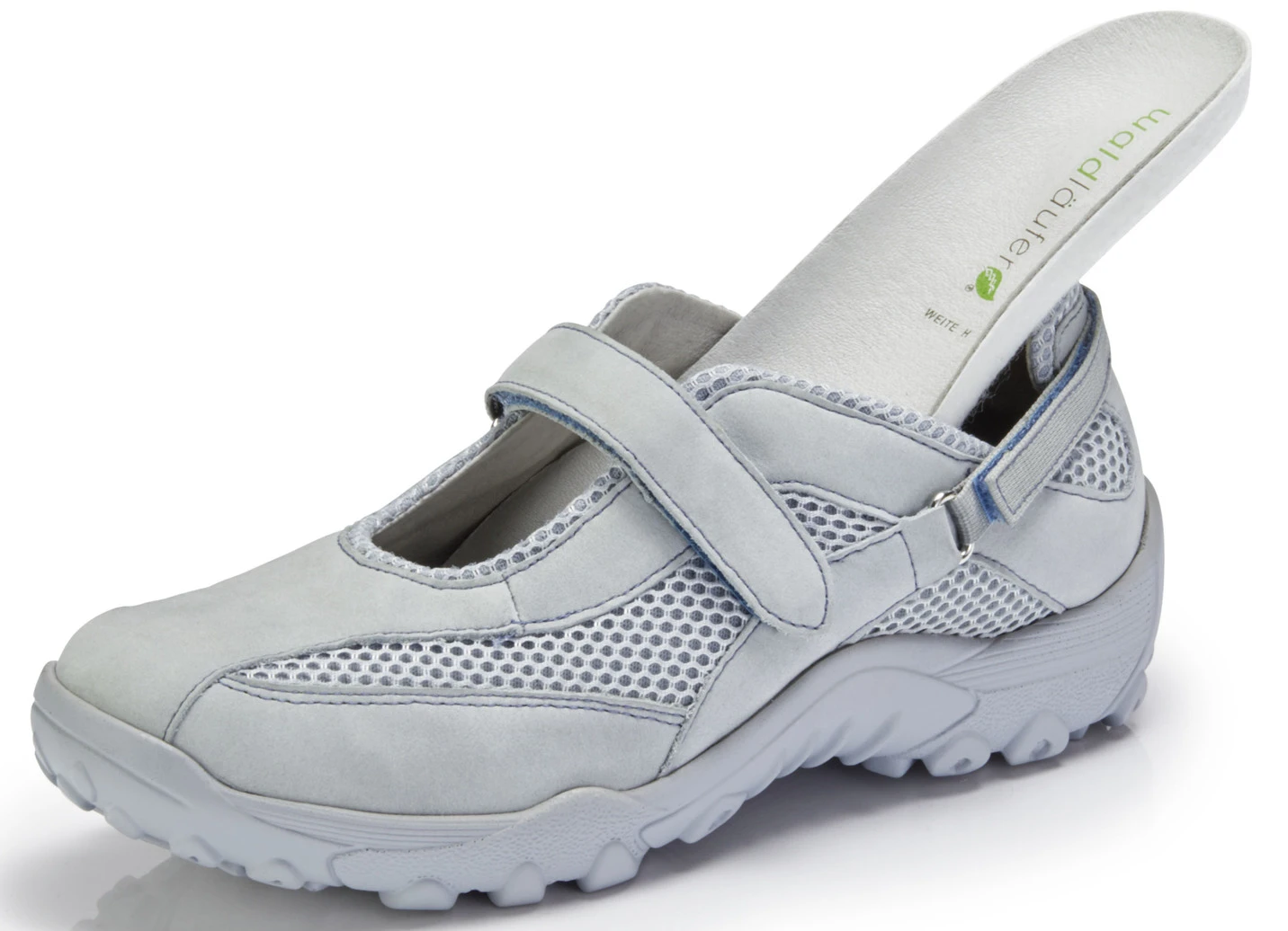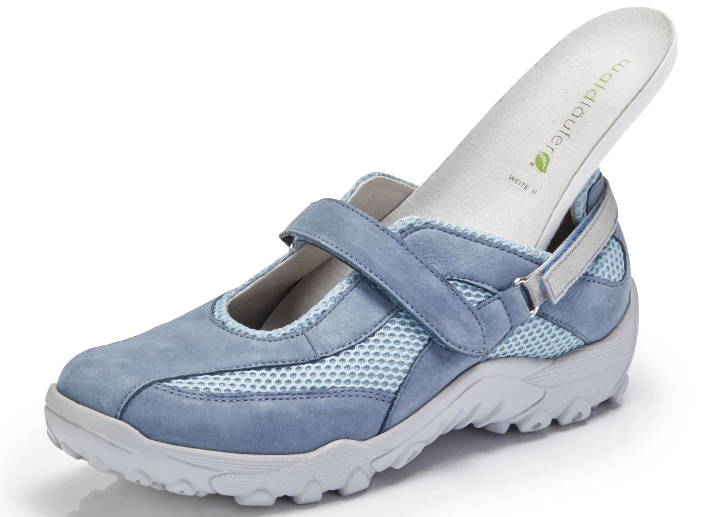 Waldläufer Slipper mit verstellbaren Klettverschlüsse in Schuhgröße 5 1/2 und in Jeans.