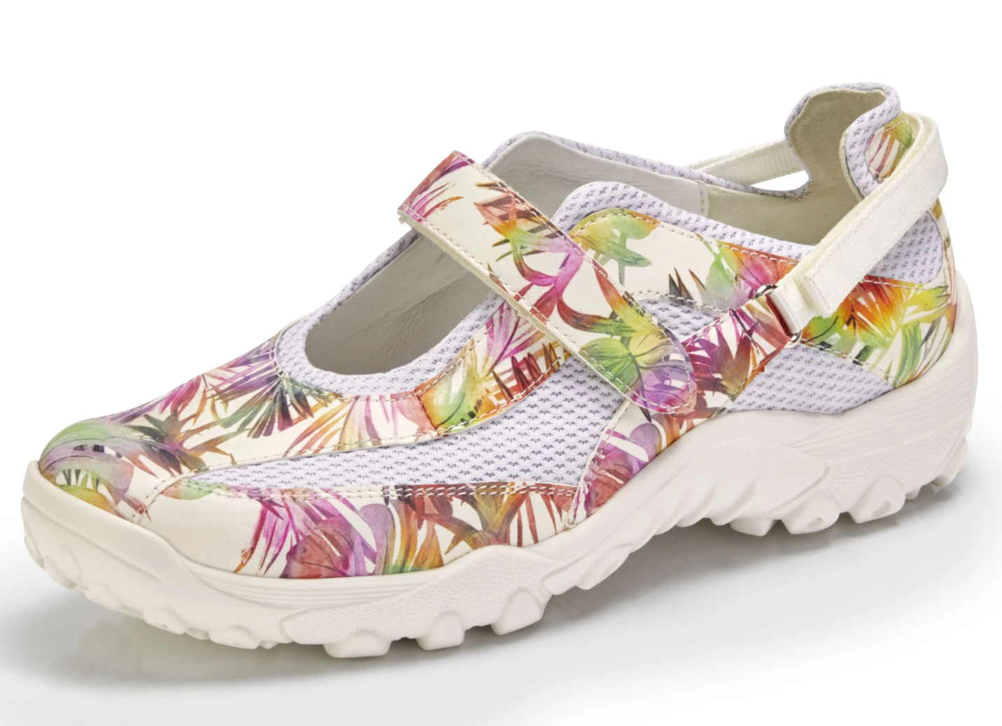 Slipper aus Nubukleder, in Weiß-Bunt aus bedrucktem Nappaleder, mit Textileinsätzen: Weite H, zwei verstellbare Klettspangen, ledergefüttertes Quartier, herausnehmbares Lederfußbett, leichte PU-Profilsohle sowie 20 mm Keilabsatz